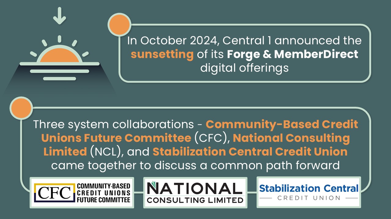 In October 2024, following Central 1’s announcement to wind down its digital banking business, concerned representatives from credit unions and system organizations – Community-Based Credit Unions Future Committee (CFC), National Consulting Limited (NCL), and Stabilization Central Credit Union – came together as a group to discuss its impacts and brainstorm on ways we might work together to overcome this challenge.